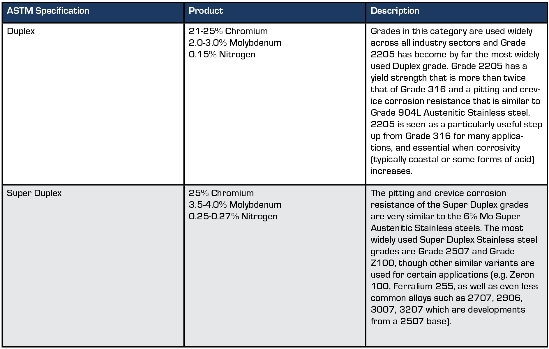 The difference between Duplex and Super Duplex Stainless steel is the Chromium, Molybdenum and Nitrogen contents.